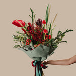 El Bouquet de Navidad Ora es una composición curada con flores y follajes de temporada en tonos rojos y verdes, diseñada para transmitir calidez y espíritu festivo. Envuelto en tela texturizada verde menta y finalizado con cintas de terciopelo en tonos festivos, este bouquet combina texturas, berries y acentos naturales que lo convierten en el regalo perfecto o el centro de mesa ideal para reuniones y momentos especiales de diciembre.